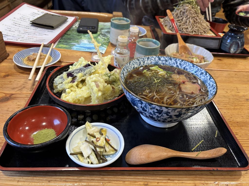 ちょっと早めの11時過ぎに到着。この辺りでは定評のある店のようで、もうすでに店内何組かお客さん入っていました。名物のモツ煮と蕎麦と天ぷらも注文。このモツ煮がやたら旨かった。お蕎麦も筑北村の蕎麦粉を使った二八の細麺で味良し風味良しに加え量もかなり多い。大盛りを頼んだ夫はほぼ二人前と格闘。